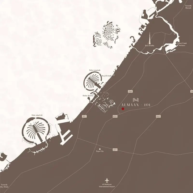 ALMAAN 101 delivers its residents the ultimate suburban experience combined with effortless access to urban areas which Jumeirah Village Circle (JVC) provides. JVC offers a self-sufficient living environment that includes all essential services as it features family-friendly parks, active rental markets, supermarkets, educational institutions, medical centers, dining establishments, workout facilities and Circle Mall. The location of the building situates it close to essential highways which include Al Khail Road and Sheikh Mohammed Bin Zayed Road, thus providing commuters with fast transportation links to important sites such as Dubai Marina, Downtown Dubai and Dubai International Airport.