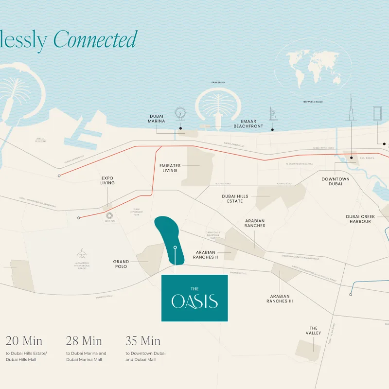 The location of Mareva by Emaar at The Oasis is a prime area in Dubai, providing easy access and convenience. Both residents and investors favor it due to its convenient proximity to transportation hubs, tourist attractions and critical locations. Residents’ close proximity to Dubai’s commercial districts, recreational zones and notable landmarks enhances their overall standard of living. The strategic location presents expansion potential, making it an attractive investment destination.
