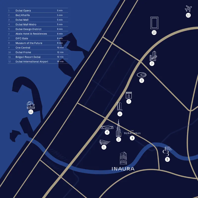 Arada Inaura Hotels & Residences location at Downtown Dubai holds an unparalleled strategic location at the very heart of the city, establishing it as a global commercial and tourist hub. Its primary advantage is its central placement, providing immediate access to major road networks like Sheikh Zayed Road and quick connectivity to the Dubai International Financial Centre (DIFC) and Business Bay. As the home of the Burj Khalifa, The Dubai Mall, and the Dubai Fountain, it guarantees sustained visitor interest and exceptionally high rental demand. This district offers a highly sought-after, walkable lifestyle rich in world-class dining, retail, and entertainment, ensuring robust capital appreciation and premium yields for investors.