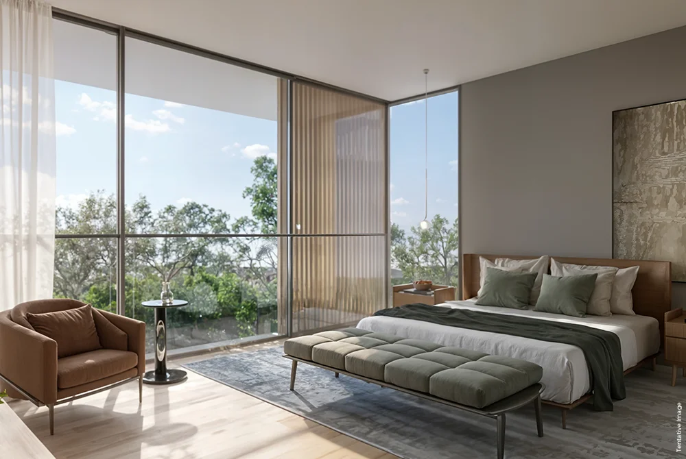 The setting in each residence epitomizes contemporary open plan living, with European brand appliances being premium and hardwood floors being porcelain countertops, along with tremendous glazing for soaking the interiors in natural light.