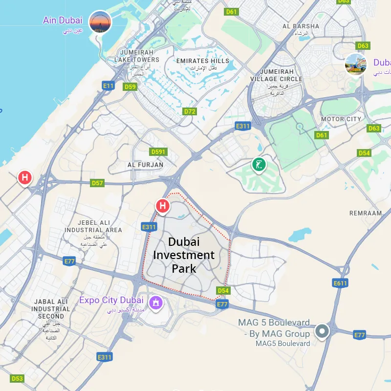 Riverside Views Indigo 1 location at Damac Riverside community, which is part of the broader Dubai Investment Park. You can reach Emirates Road and Al Yalayis Street linking you to Dubai’s main sights. Being close to these roads means you can get to key spots and landmarks fast.