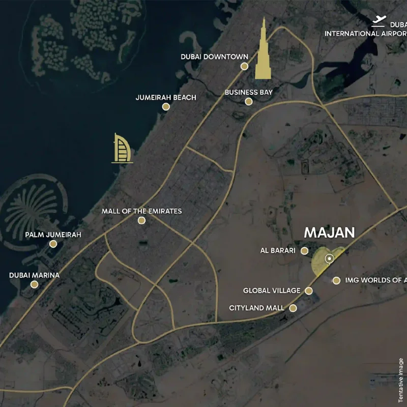 Barari Heights location in Al Majan, Dubai, sits in one of the newly developing residential areas of the city. Direct proximity to Sheikh Mohammed Bin Zayed Road allows neighbors to quickly get important locations. Green settings, stores, schools, and healthcare facilities surround the development, offering the ideal mix of urban ease and natural tranquilly for a well-balanced way of life.