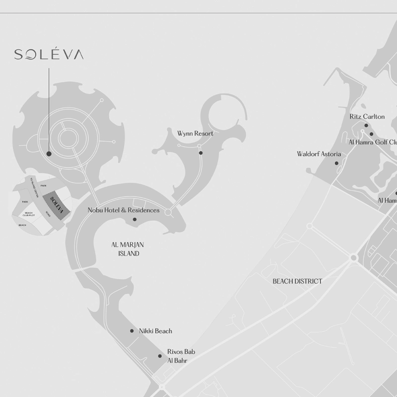Soleva Beach Residences location at Al Marjan Island, Ras Al Khaimah presents an ease of access to both nature and urbanization for the residents. Priding themselves with luxury residences along the unspoilt coastline, the lands offer amazing waterfront views and a peaceful atmosphere but are also a few minutes drive to cultural, business, and entertainment areas within the city of Ras Al Khaimah. The strategic location guarantees an almost ideal combination of peace away from the busy urban setup and accessibility which is very much needed by clients looking for high-end comfort.
